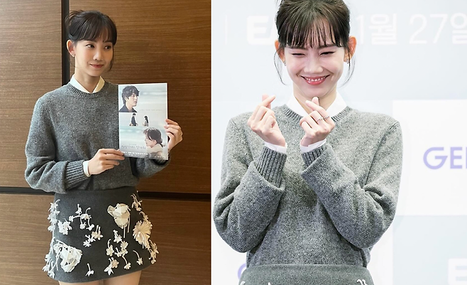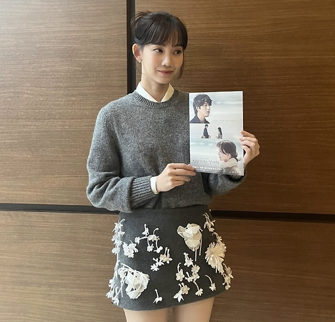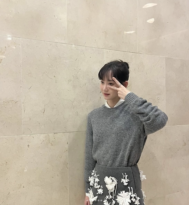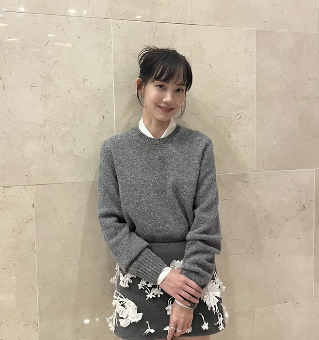 사진 속 신현빈은 흰 셔츠를 이너로 입고 그레이 니트에 화려한 장식이 있는 그레이 미니 스커트를 입었다.