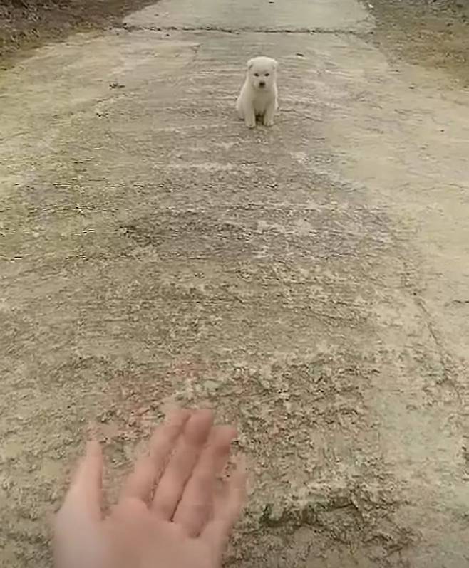 길 한복판에 덩그러니 앉아있던 뽀송한 아기 백구 한 마리.