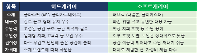 휴가철이 다가오면서 해외여행이나 국내 장거리 여행을 계획하는 사람들이 많다. 여행 준비에서 빠질 수 없는 준비물 중 하나가 바로 캐리어. 특히 해외여행을 계획하고 있다면, 공항이나 비행기 안에서도 안전하고 편리하게 휴대할 수 있는 캐리어가 필수품이다. 그렇다면 단단한 하드 캐리어와 부드러운 소프트 캐리어 중 어떤 제품을 구매해야 할까? 내 여행 스타일에 꼭 맞는 캐리어와 인치별 추천 제품까지 알아보자.
