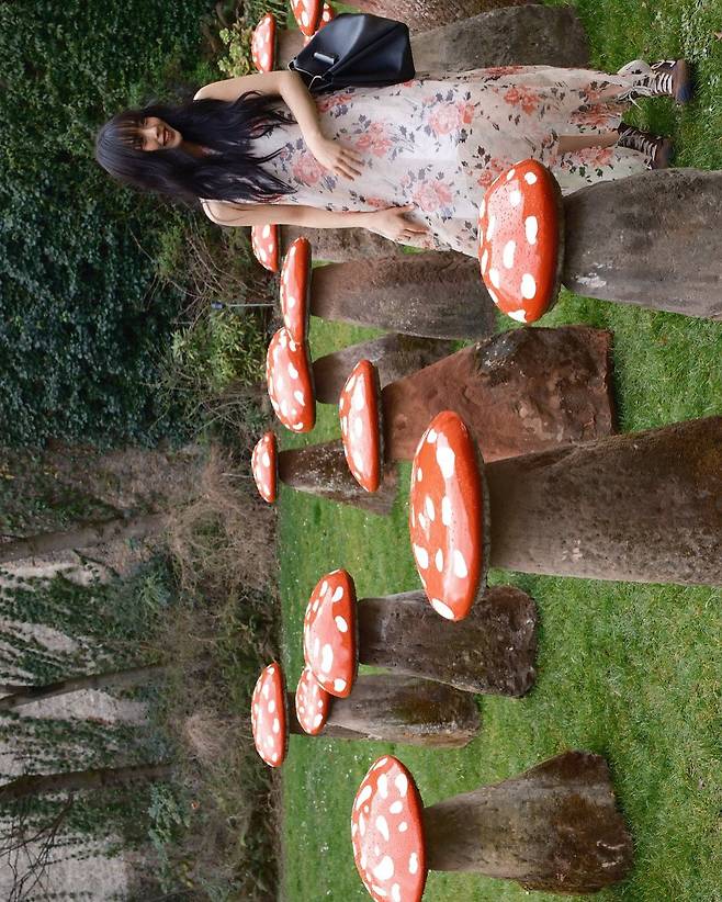 버섯 조형물이 가득한 가든, 거대한 과일 오브제가 있는 실내 공간 등 독특한 배경과 함께 고민시의 룩이 더욱 특별해 보였어요.