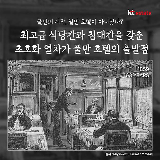 이후 풀만은 19세기 중반부터 유럽에서 최고급 식당칸과 침대칸을 갖춘 초호화 열차를 도입한 것을 시작으로 철도 노선 주변으로 ‘풀만 호텔’을 건립하는 등 20세기 중반까지 유럽에서 브랜드를 키워 나갔습니다.