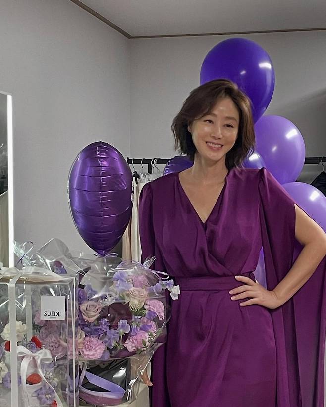 배우 김성령이 선보인 퍼플 색상의 우아한 드레스가 시선을 사로잡고 있다. 깊게 파인 V넥 라인과 여유로운 실루엣의 새틴 소재 드레스는 고급스러움을 더하며, 김성령의 세련된 이미지를 완벽하게 표현하고 있다. 특히 보라색 풍선과 꽃다발로 꾸며진 공간에서 같은 계열의 의상을 매치해 통일감 있는 스타일링을 연출하고 있다. 화려한 장식 없이도 단색 드레스만으로 존재감을 드러내는 김성령의 패션 센스가 돋보인다.
