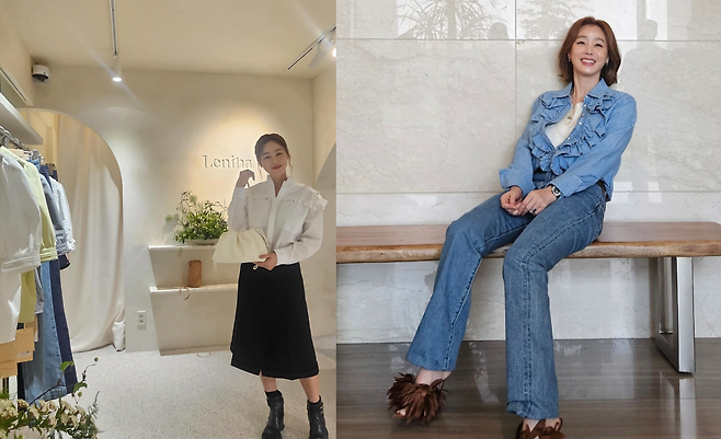 'Lenitha' 매장에서 포착된 김성령의 모던한 블랙 앤 화이트 스타일링이 눈길을 끈다. 프릴 디테일이 가미된 화이트 블라우스와 미디 길이의 블랙 스커트의 조합은 클래식하면서도 현대적인 감각을 보여준다. 여기에 크림색 클러치백과 블랙 앵클부츠로 포인트를 주어 세련된 분위기를 완성하고 있다. 미니멀한 공간과 어우러진 모노톤 룩은 김성령의 우아한 이미지를 한층 더 부각시키고 있다.