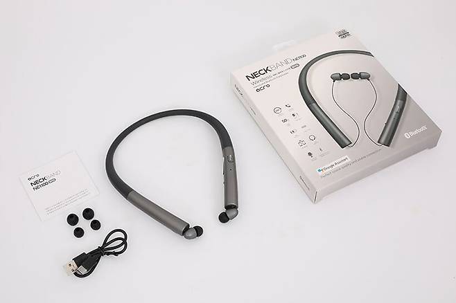 구성품으로는 아크로 넥밴드 릴타입 블루투스 NE1100 이어폰 본체와 두 쌍의 추가 이어팁, 충전용 USB 케이블, 그리고 사용 설명서가 기본 제공된다.