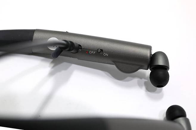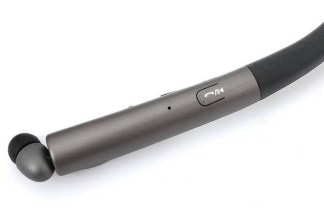 착용했을 때 사용자의 왼편에 위치하는 부분에는 버튼이 하나 있는데, 음악 재생과 일시 정지, 통화 수신, 다음곡 등의 기능을 이 버튼 하나로 모두 컨트롤한다. 버튼 바로 아래 보이는 구멍은 음성통화를 위한 마이크가 내장된 곳이다.
