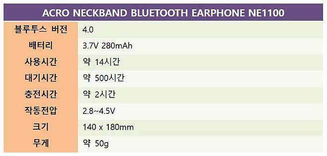 아크로 넥밴드 릴타입 블루투스 NE1100은 오토 릴 방식으로 번거로운 선 정리 없이 깔끔하게 쓸 수 있으며, 진동 알림 기능을 제공해 알림을 더욱 확실하게 인식할 수 있다. 또한 한 번 충전으로 14시간 가량 연속 사용이 가능하며, 음악 감상용으로 사용하지 않고 음성통화용으로 주로 쓴다면 500시간의 긴 대기시간으로 더욱 오래 사용할 수 있다. 뿐만 아니라 50g의 가벼운 무게로 목에 걸고 여러 활동을 해도 전혀 부담이 없어서 업무용이나 운동용 이어폰으로도 손색이 없을 것으로 보인다.