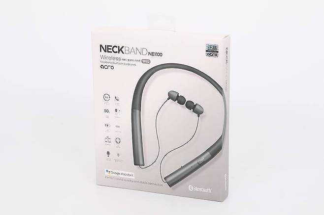 아크로 넥밴드 릴타입 블루투스 NE1100은 납작하고 넓은 박스에 담겨있다. 박스 앞면에는 제품의 컬러 이미지와 주요 특징이 자세하게 인쇄되어 있어서 제품 디자인이나 기능을 파악하기는 어렵지 않다.
