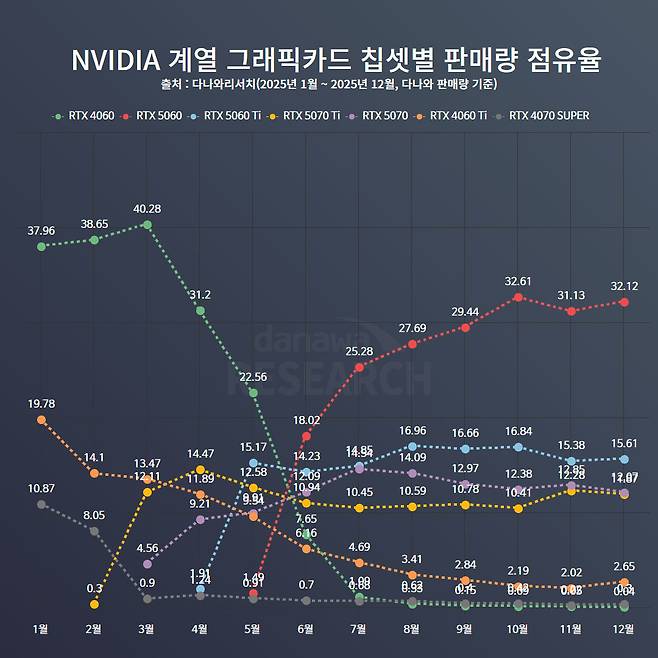 가장 두드러진 변화는 2025년 6월 RTX 5060의 등장과 동시에 그래픽카드 시장의 주도권이 완전히 이동했다는 것이다. 상위 라인업 위주로 형성돼 있던 시장에 보급형 엔트리 모델이 본격적으로 합류하면서, 이전 세대였던 RTX 4060의 수요를 그대로 흡수한 결과다. 실제로 RTX 5060 출시 두 달 전까지만 해도 RTX 4060은 40.48%라는 압도적인 점유율로 시장 1위를 지키고 있었다. 그러나 RTX 5060이 등장한 이후 급격한 하락세를 보이며, 2025년 말에는 사실상 시장에서 퇴장한 수준에 이르렀다.
