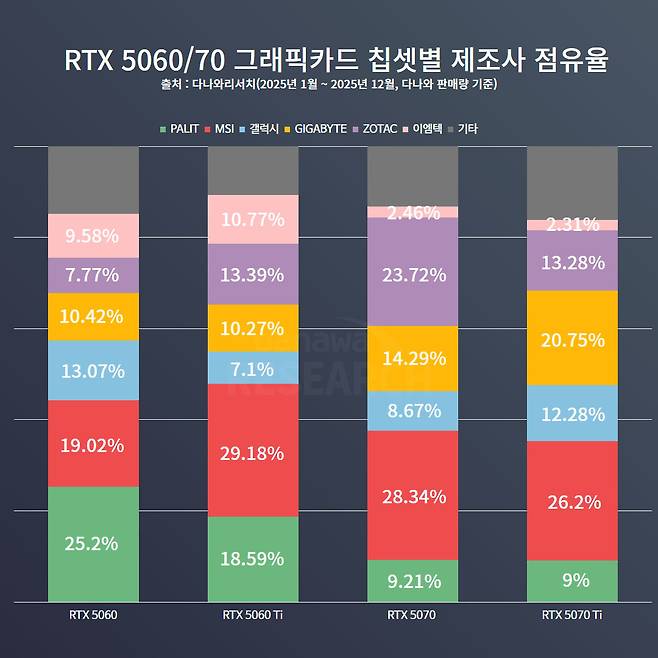 제조사별 판매 점유율은 칩셋 라인업에 따라 뚜렷한 차이를 보였다. RTX 5060 계열은 PALIT이 25.2%로 1위를 차지했으며, MSI가 19.02%로 그 뒤를 잇는 구도다. 가격 경쟁력이 중요한 엔트리 구간의 특성이 그대로 반영된 결과라 볼 수 있다. 체급이 한 단계 올라가면서 판도는 MSI 중심으로 재편된다. RTX 5060 Ti부터 MSI가 29.18%로 1위에 올라섰고, RTX 5070과 RTX 5070 Ti 제품군에서도 각각 28.34%, 26.2%의 점유율을 기록하며 선두 자리를 유지했다. 쿨링 설계와 완성도가 중요한 상위 라인업에서 MSI의 강점이 본격적으로 드러난 셈이다. 이와 함께 ZOTAC과 GIGABYTE 역시 상위 라인업으로 갈수록 점유율을 꾸준히 끌어올리며, MSI와 함께 중·상급 그래픽카드 시장의 핵심 축을 형성하는 모습을 보이고 있다.