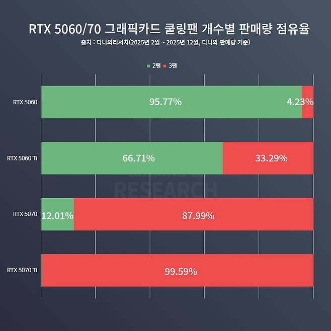 RTX 5060은 하드웨어 특성상 발열이 크지 않아 2팬 제품의 판매량 점유율이 95.77%로 압도적이다. 덕분에 제품의 길이와 두께를 슬림하게 설계할 수 있어 SFF나 미니-ATX 시스템을 구성하려는 사용자에게 최적의 선택지로 손꼽힌다. 여기에 3팬 모델 대비 약 5만 원가량 낮은 가격 경쟁력까지 더해지며 높은 점유율을 뒷받침하고 있다.
