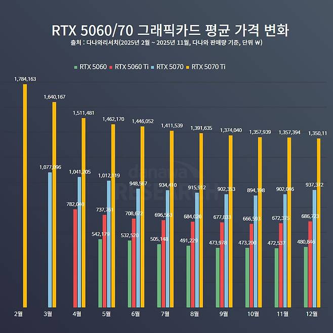 다만 서두에서 언급한 것처럼 최근 전 세계적인 메모리 가격 급등은 그래픽카드 시장에도 변수로 작용하고 있다. 이에 따라 엔비디아와 AMD 모두 2026년 1분기 가격 인상을 검토 중이라는 전망이 이어지는 상황이다. 실제로 평균 가격 그래프에서도 11월에서 12월로 넘어가는 구간에서 일부 칩셋의 가격이 소폭 반등하는 흐름이 포착된다. 그래픽카드 구매를 고민 중인 소비자라면 현재 시점을 안정 구간의 끝자락으로 인식하고 결정을 서두를 필요가 있어 보인다.