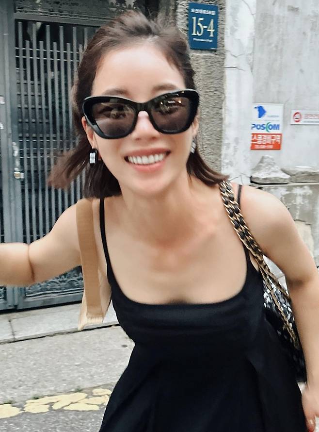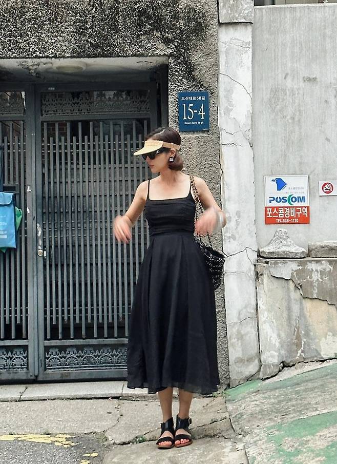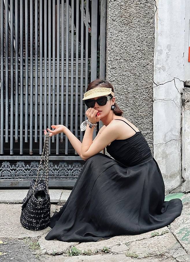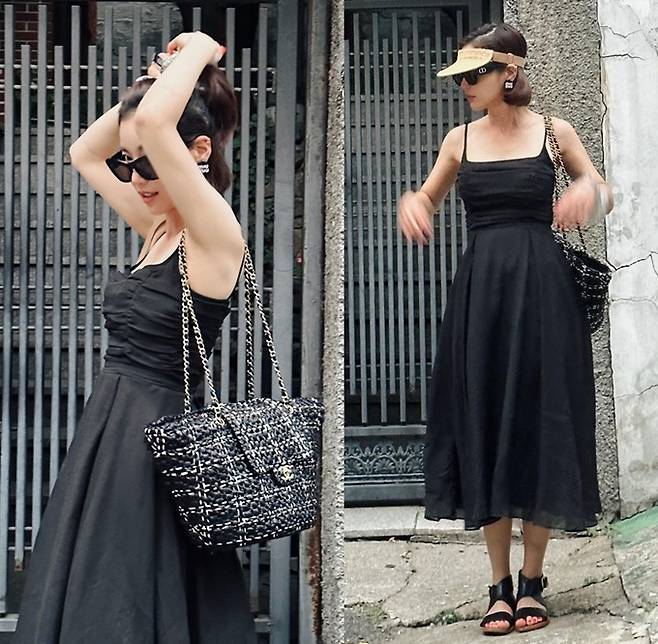 공개한 사진에서 기은세는 어깨가 드러난 블랙 슬립 원피스에 선글라스와 선캡을매치한 멋스러운 섬머 콘서트룩을 완성했다.