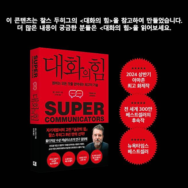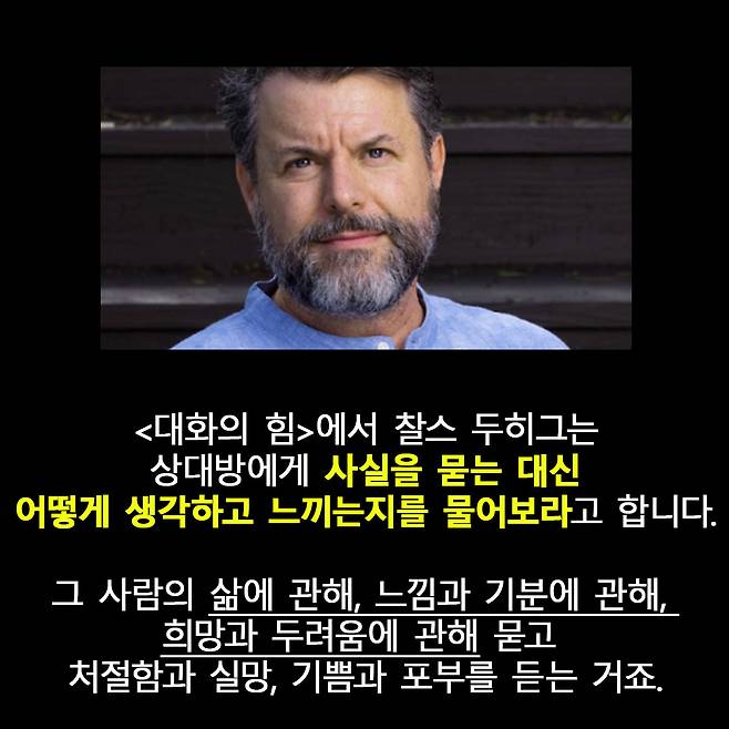 『대화의 힘』의 저자 찰스 두히그는 사실보다는 느낌과 기분 등 삶의 정서적 요소에 대한 이야기를 듣는 게 중요하다고 말합니다.
