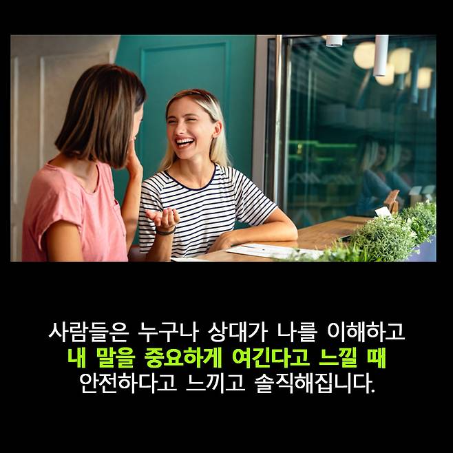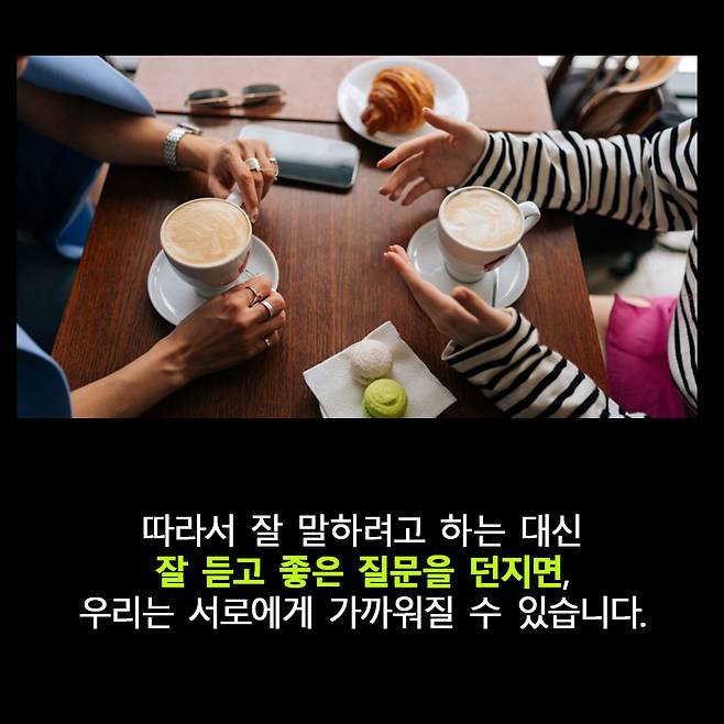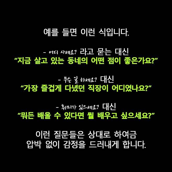 마지막으로, 상대의 대답에는 꼭 추가 질문을 하세요. 상대의 말에 이어서 질문한다는 것은 그 사람의 말을 듣고 있고, 더 알고 싶다는 신호이기 때문에 상대는 자연스럽게 마음을 털어놓게 됩니다.