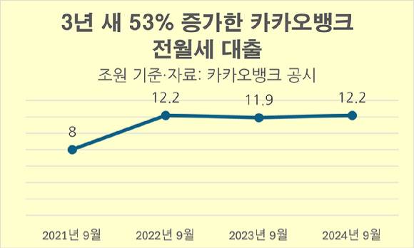 카뱅의 전월세 대출 잔액은 올해 9월 말 현재 12조2000억원에 이른다. 1년 전 같은 기간보다 2.5% 증가했다. 2021년 같은 기간보다 53%나 증가했다.