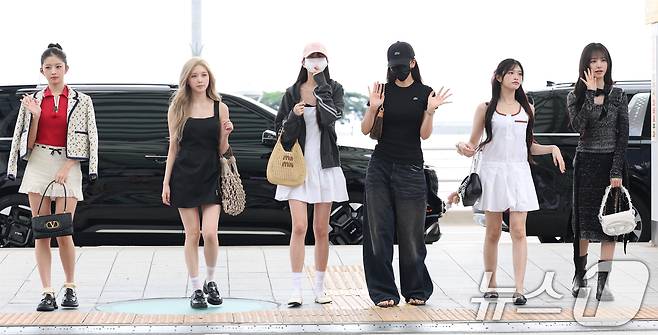 (인천공항=뉴스1) 권현진 기자 = 아이브 레이(왼쪽부터)와 가을, 장원영, 안유진, 이서, 리즈가 31일 오후 해외 일정을 위해 인천국제공항을 통해 미국 LA로 출국하기 전 인사를 하고 있다. 2025.7.31/뉴스1