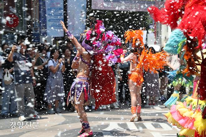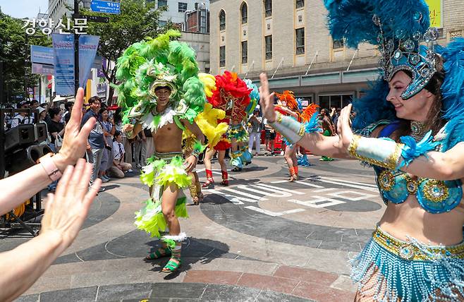 형형색색의 삼바 의상을 입은 공연자들이 올여름 서울 지역 첫 폭염주의보가 발효된 19일 명동 거리에 나타났다. 양산 등으로 얼굴을 가리고 바삐 걸음을 옮기던 시민들은 멈춰 서서 삼바 공연을 구경했다.