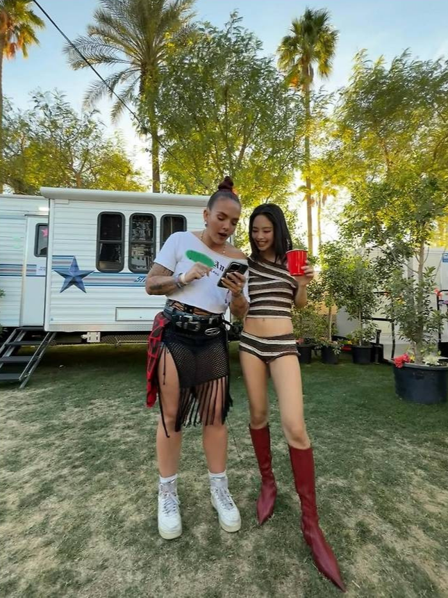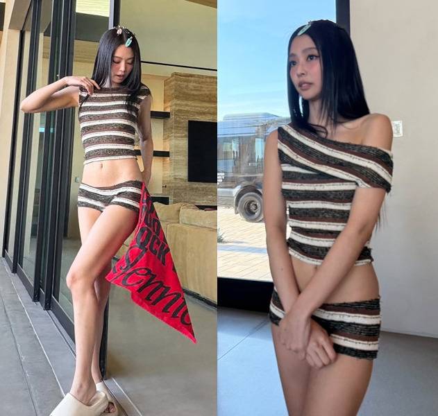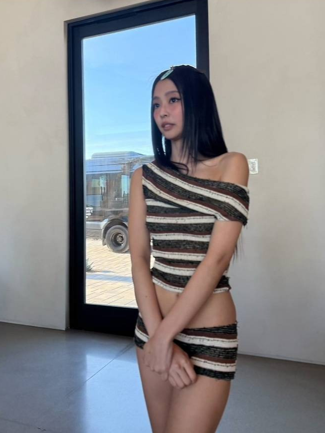 크롭 톱과 초미니 팬츠로 구성된 스트라이프 셋업을 입고 글래머러스한 실루엣을 드러내며 시선을 사로잡았습니다.