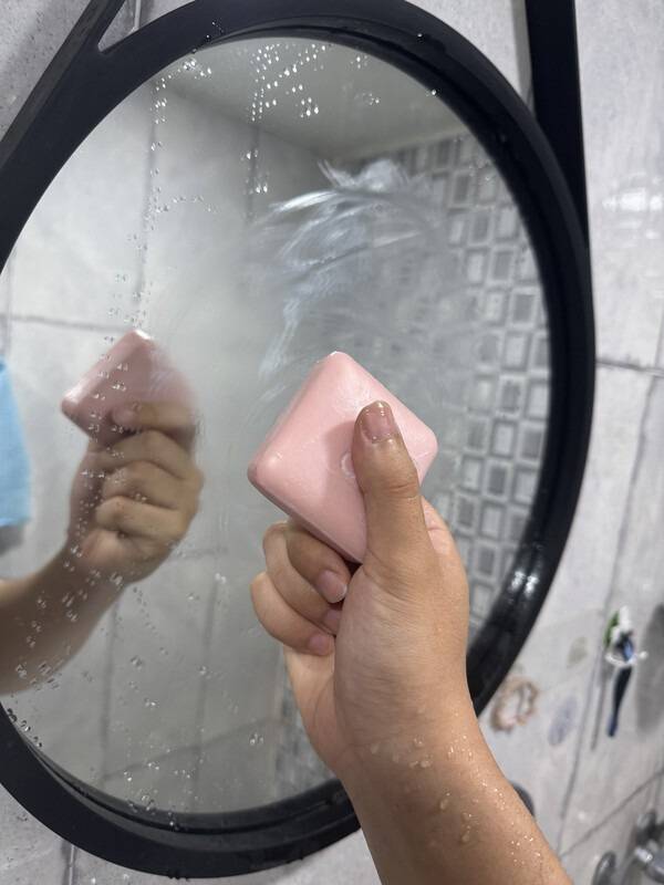 마른 비누를 거울 표면에 골고루 문질러 얇은 막을 만듭니다.