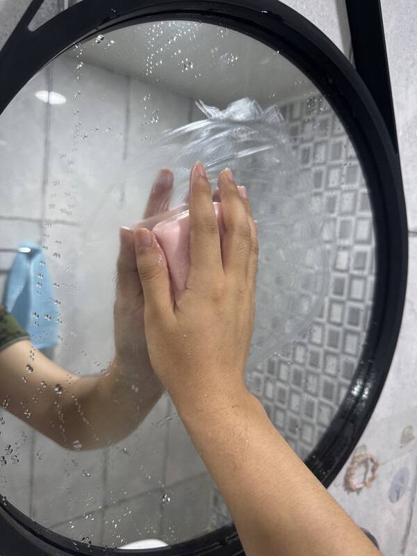 비누칠한 거울을 부드러운 마른 천으로 닦아, 얼룩이 남지 않게 고르게 펴줍니다.