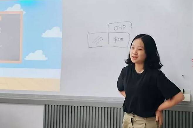 공개된 사진 속 김설은 교실로 보이는 곳 칠판 앞에서 발표를 하는 중이며, 자신감 있는 포즈가 눈에 띕니다.