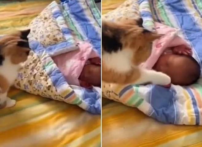 아무래도 고양이의 눈에도 아기가 한없이 작고 귀여웠던 모양인데요. 한참 동안 아기만 바라보던 고양이의 행동이 예사롭지 않습니다.