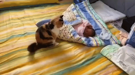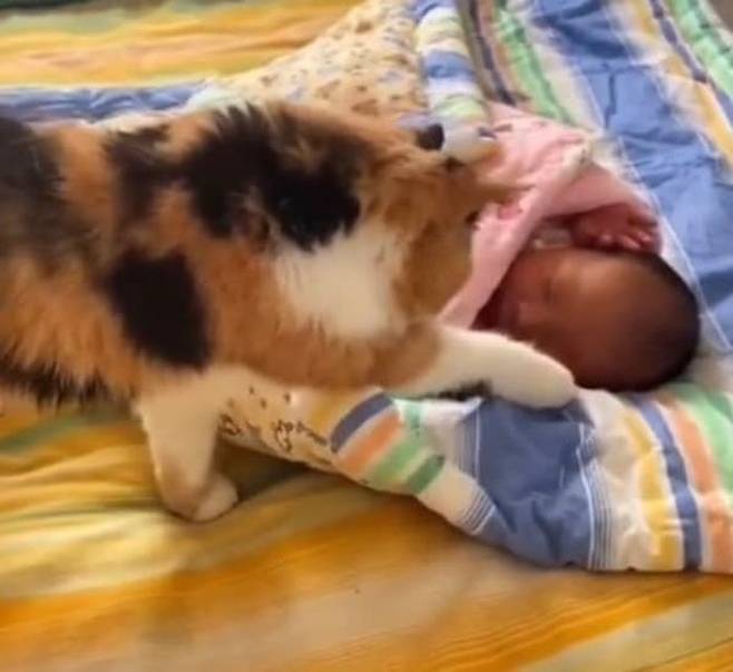 고양이는 태어난지 얼마 안된 상태로 집에 온 아기를 보더니 잠시후 이렇게 행동했다고 하는데요.