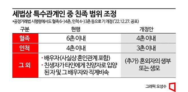 세법상 특수관계인에 해당하는 친족 범위도 줄어든다. 우선 혈족은 기존 6촌 이내에서 4촌 이내로 축소된다. 인척의 경우 기존 4촌 이내에서 3촌 이내로 조정된다. 혼외자의 생부나 생모는 특수관계인에 해당하는 친족 범위에 추가됐다. 앞서 공정거래위원회는 지난달 이 같은 내용을 담은 공정거래법 시행령 개정안을 공포했다.