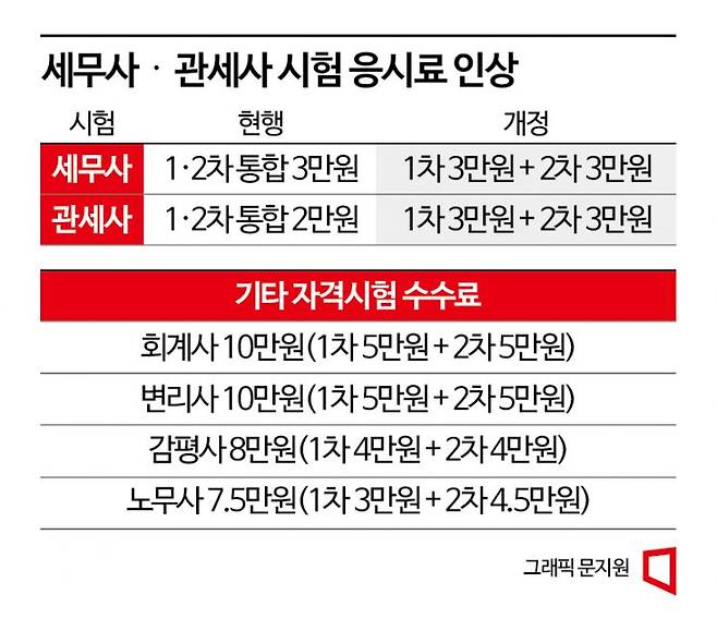 구체적으로 보면 내년부터 세무사 시험 응시료가 기존 3만원에서 6만원으로 인상된다. 당초 세무사 시험 응시료는 1·2차 시험을 합쳐 3만원이었지만 1차와 2차 시험 각각 3만원씩 내야 한다. 관세사 시험 응시료도 기존 1·2차 통합 2만원에서 1·2차 각각 3만원씩 3배 오른다.