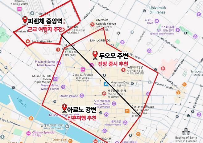 피렌체에 도착하는 기차가 서는 중앙역 주변은 가장 많은 여행자가 선택하는 지역입니다. 추천 대상은 피렌체 일정이 짧은 여행자, 피사나 시에나 등 근교 당일치기 일정이 많은 여행자, 무거운 짐을 들고 걷는 것을 극도로 싫어하는 분들입니다.