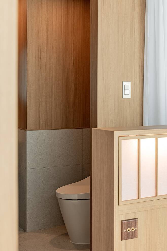 전체 우드 톤으로 통일감 있게 마감한 거실 욕실입니다.