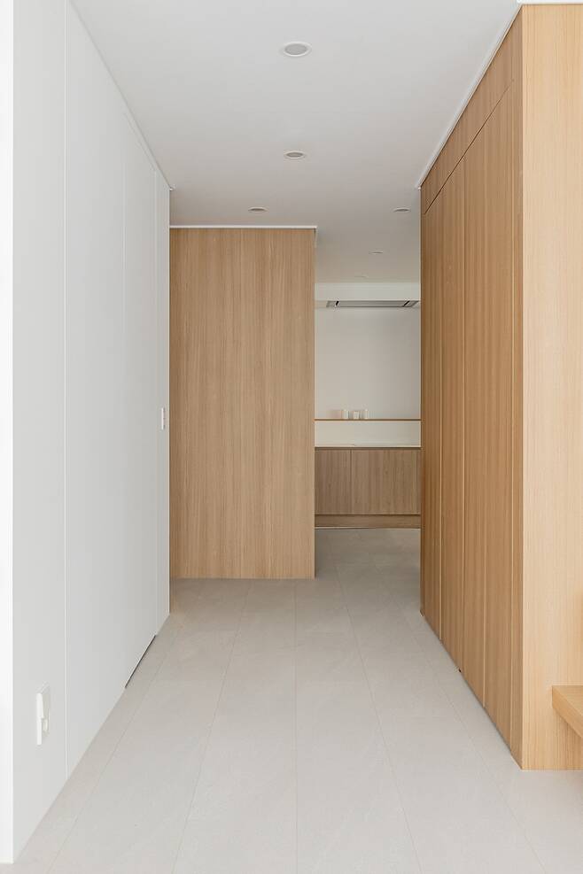 복도 좌측에 위치한 거실 욕실을 히든도어로 구성하고, 맞은편 세탁실 역시 푸쉬풀 도어를 두어 벽처럼 보이도록 디자인했습니다.