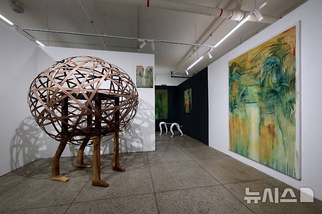 [부산=뉴시스] 박진희 기자 = 부산시와 문화기획사 AML이 주관한 신진 작가 공모 당선전 ‘부산 커넥티드’가 열리고 있는 5일 부산 중구 부산근현대역사관 금고미술관에 당선팀들의 작품들이 전시되어 있다. 이번 공모전은 작가 2인이 한 팀을 이루어 하나의 전시를 완성하는 방식으로 구성되어, 작품 속에서 '연결과 연대'의 주제가 더욱 깊이 표현된다. 금고미술관은 2024년에 새롭게 복합문화공간으로 탈바꿈한 부산근현대역사관의 지하에 위치한 독특한 전시 공간이다. 과거 한국은행 부산본부의 금고로 사용되었던 공간이다. 2024.11.05. pak7130@newsis.com
