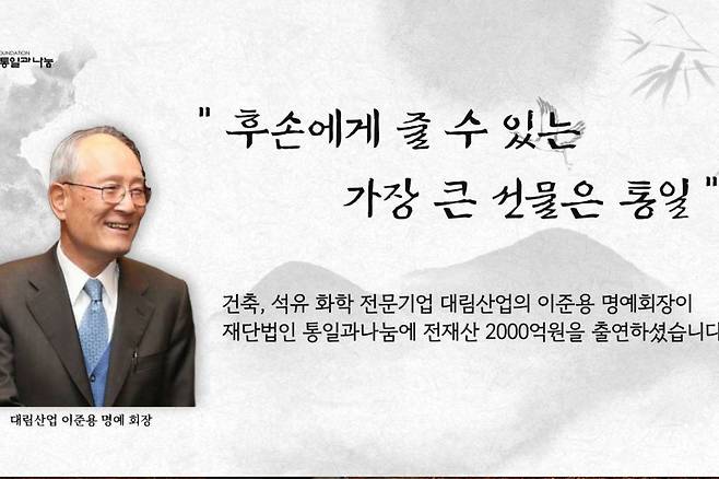 한편, 이준용 명예회장이 사재 2,000억 원을 기부했던 통일과 나눔은 당시 설립된 지 석 달도 되지 않은 신생재단으로 알려지며 주목받았다. 해당 재단의 설립 취지는 남북 교류협력과 인도적 대북 지원, 남북 주민 간 공동체 의식 함양 등의 사업을 수행하고 이를 위한 기금을 조성해 통일을 준비하고 통일 기반을 조성하는 것으로 알려졌다.