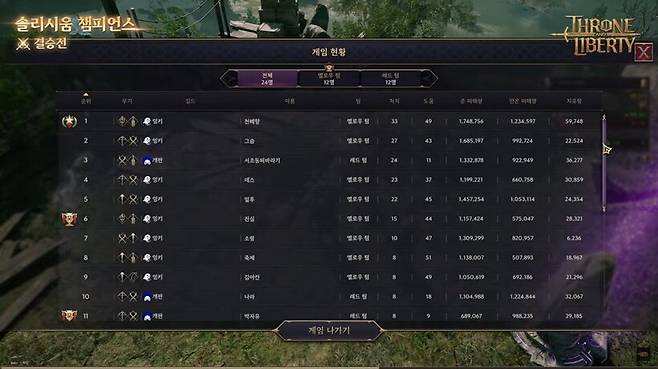 7월 31일(목), 쓰론 앤 리버티의 '솔리시움 챔피언스' 시즌1 결승전이 진행됐다. 이번 경기는 TL 공식 유튜브 채널에서 생중계됐으며, 게임 내 PvP 콘텐츠인 12vs12 대전장에서 치열한 토너먼트 경쟁을 뚫고 올라온 '유령'과 'Whatever' 두 팀이 맞붙었다. 3판 2선승제로 진행된 결승전은 유령 팀이 조금 더 집중력 있는 모습을 보이며 2:0으로 솔리시움 챔피언스 첫 우승을 차지했다.