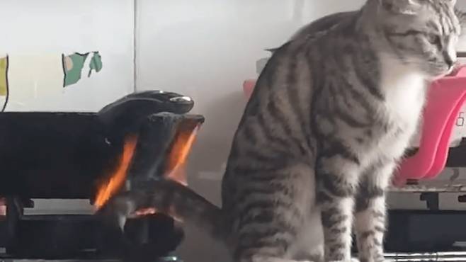주인이 요리를 하던 중, 장난기 가득한 고양이가 몰래 가스레인지 옆으로 올라갔습니다. 호기심 가득한 눈빛으로 주변을 두리번거리며 모든 것을 탐색하는 모습이었습니다.