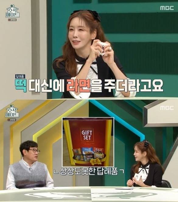 방송인 김정은은 MBC 예능 ‘호적메이트’에서 이예림 결혼식에 참석했을 당시를 떠올리며 “떡 대신 라면을 받았다”고 말했다.
