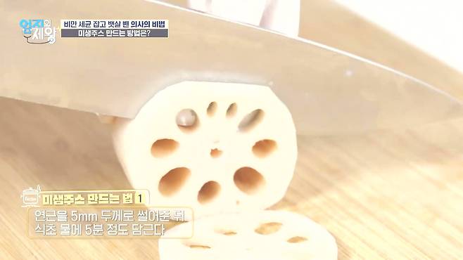 첫 번째 연근을 5mm 두께로 썰어준 뒤