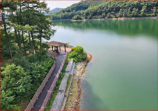 마장호수에 도착하면 가장 먼저 느껴지는 건 평화로운 물빛입니다.맑은 하늘을 비추는 호수, 주변의 울창한 산림, 그리고 군데군데 피어나는 수초들이 절묘한 조화를 이룹니다.