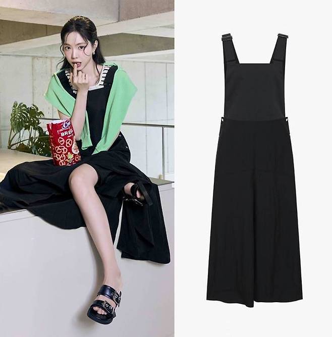 'JJ지고트'의 오버롤 원피스는 스커트 부분 텍스쳐 블록으로 대비감을 연출하며 심플한 티셔츠 등 레이어드하면 클래식한 섬머룩으로 변신한다.