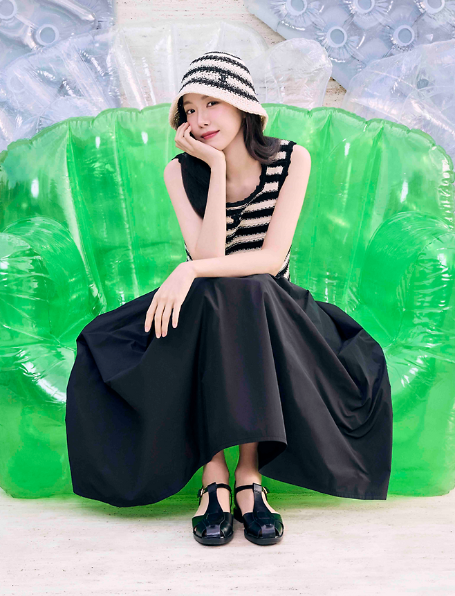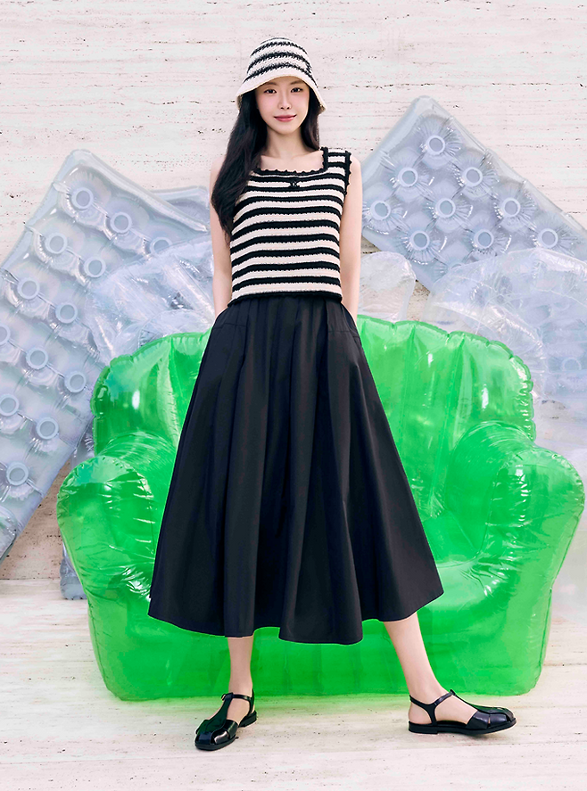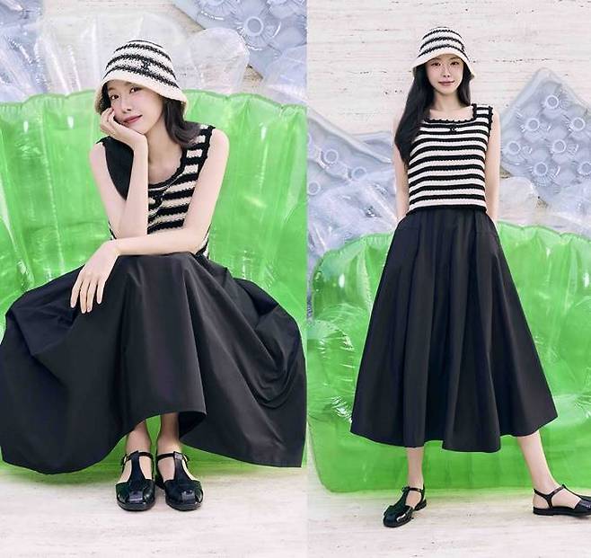 손나은이 착용한 'JJ 지고트' 스트라이프 민소매 니트는 단독 착용 또는 레이어드룩에 활용할 수 있는 만능템으로 플리츠 밴딩 플레어 스커트와 함께하면 러블리 섬머룩, 데님 팬츠와 함께 하면 스타일리시한 데일리 섬머룩으로 변신다.
