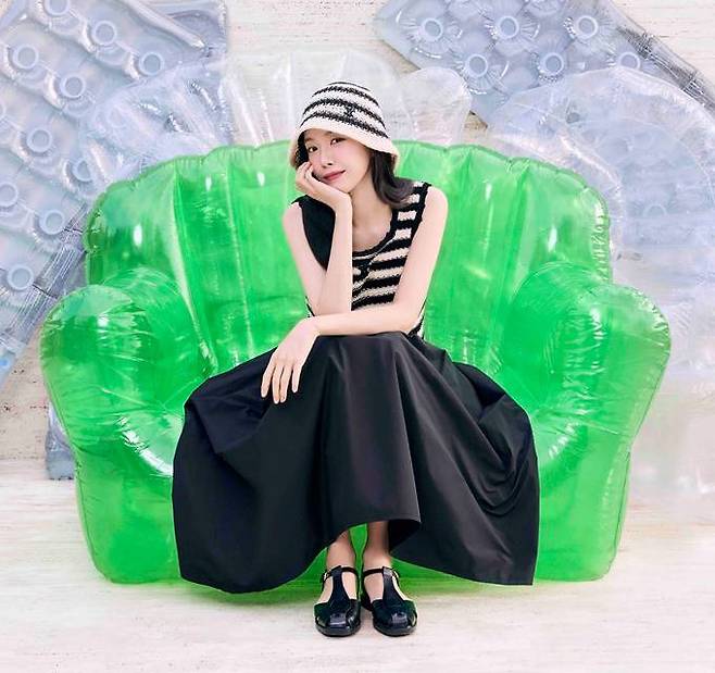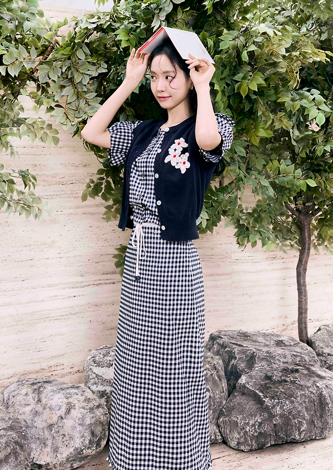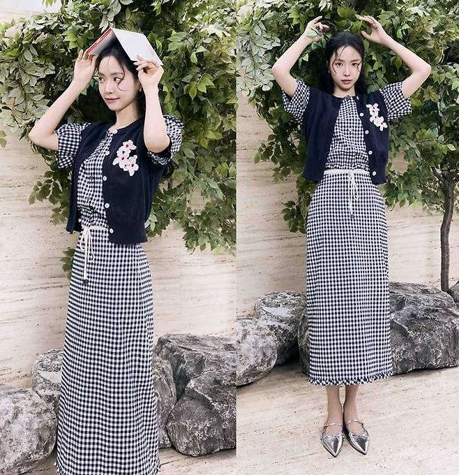 손나은은 체크 투피스와 함께 뜨게질 자수 장식 포인트의 니트 조끼를 레어어드해 경쾌하고 리드미컬한 섬머룩을 연출했다.