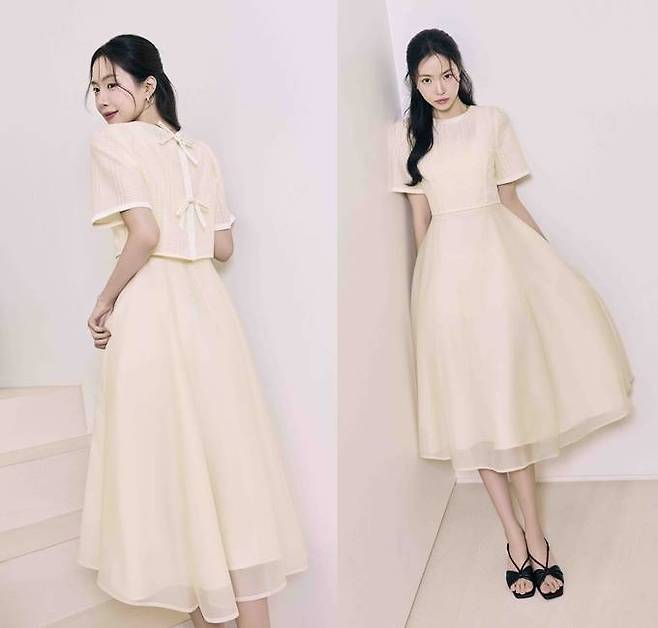 손나은이 'JJ지고트' 착용한 원피스는 스백 리본 장식의 크롭 블라우스와 세트로 출시된 투인원 원피스룩으로 옐로우 옐로우 체크 컬러감에 포인트와 벨소매, 허리핏과 플레어 실루엣이 어우러져 페미닌한 무드를 연출한다.