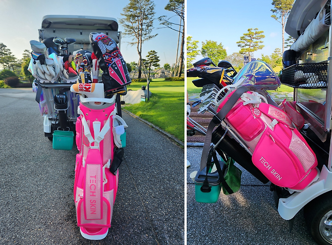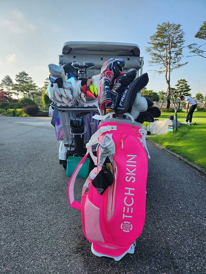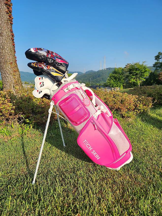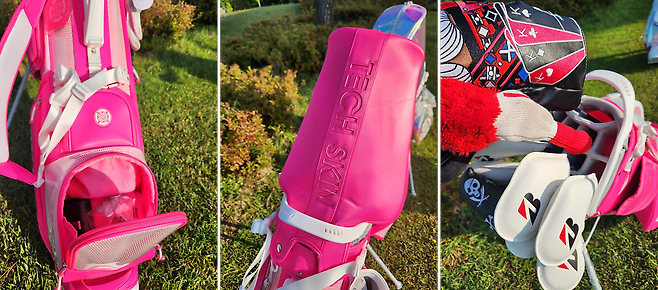 국내 브랜드 테크스킨에서 새롭게 선보이는 네온 TOUR FLEX 스탠드 백 시리즈는 총 4가지 색상으로, 그중 가장 튈 것 같은 핑크색으로 골랐습니다. 평소 "남자는 핑크!" 외쳤지만 이처럼 눈부신 핑크는 처음이네요. 그러나 디자인, 무게, 편의성, 사용성, 가성비 등 모든 면에서 생각보다 좋은 평을 받아서 신기했습니다. 여기에 매칭 색상의 휠 보스턴백이 덤으로 따라온다니 남성/여성 골퍼 모두 홀딱 반할만했습니다.