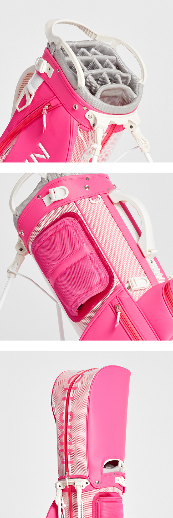 ▶ 가방 전체는 방수가 되는 TPU, PU 소재로 제작되었으며, 실용적인 포켓/주머니가 다양합니다. 물을 시원하게 유지하는 쿨러 홀더와 튼튼한 지퍼들도 인상적이네요. 가장 마음에 드는 부분 중 하나는 14분할 투입구 및 양옆과 앞으로 손쉽게 가방을 들어 올릴 손잡이가 있습니다. 어깨끈은 캐디백 같은 큼직한 싱글 스트랩이며 쉽게 탈부착 가능합니다. 마지막으로, 후드 부분을 자세히 보면 투명 소재 아래에 메쉬 소재로 디자인되어서 아주 멋스러웠습니다.