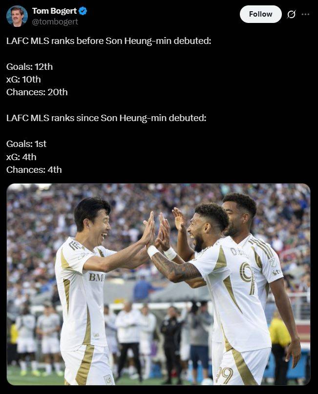 미국 스포츠 전문 기자 톰 보거트가 자신의 사회관계망서비스(SNS)에 공개한 자료에 따르면, 손흥민 합류 전 LAFC는 MLS 내 득점 12위, 기대득점(xG) 10위, 기회 창출 20위에 머물렀으나, 손흥민 합류 이후 각각 1위, 4위, 4위로 상승하며 공격 전반에서 눈부신 성과를 기록했다.