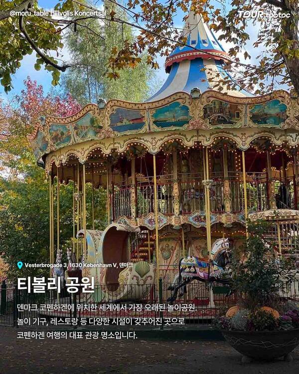 덴마크 코펜하겐을 상징하는 티볼리 공원도 빼놓을 수 없습니다. 1843년에 개장한 세계적으로 오래된 놀이공원으로 회전목마와 정원, 화려한 조명이 어우러진 곳입니다. 낮에는 활기찬 분위기를, 밤에는 로맨틱한 무드를 경험할 수 있습니다. 그래서 코펜하겐 여행을 계획하는 사람이라면 반드시 넣어야 할 여행코스이죠.