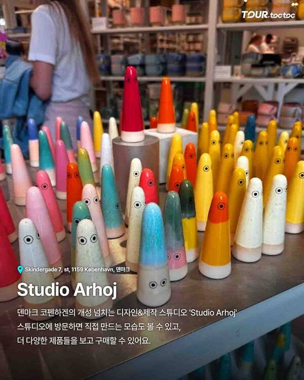 쇼핑을 즐기고 싶다면 Studio Arhoj와 HAY House가 있습니다. Studio Arhoj는 알록달록한 세라믹 오브제로 가득해 기념품으로 인기가 많습니다.