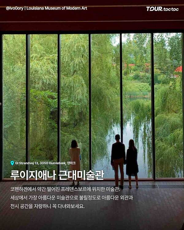 예술을 좋아한다면 루이지애나 근대미술관이 최고의 선택입니다. 코펜하겐에서 약간 떨어져 있지만 아름다운 전시 공간과 자연 풍경 덕분에 많은 여행자들의 마음을 사로잡았습니다. 유리창 너머로 펼쳐진 바다와 숲의 풍경이 전시만큼이나 아름답습니다. 코펜하겐 가볼만한곳 중 특별한 경험을 원한다면 꼭 방문해야 할 미술관이죠.