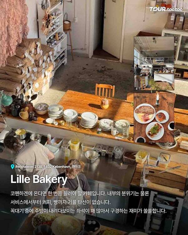 또 다른 추천지는 Lille Bakery입니다. 주방이 보이는 독특한 구조와 감각적인 분위기가 매력적입니다. 코펜하겐 가볼만한곳 중에서 카페 탐방을 원한다면 기억해둘 만한 장소죠.